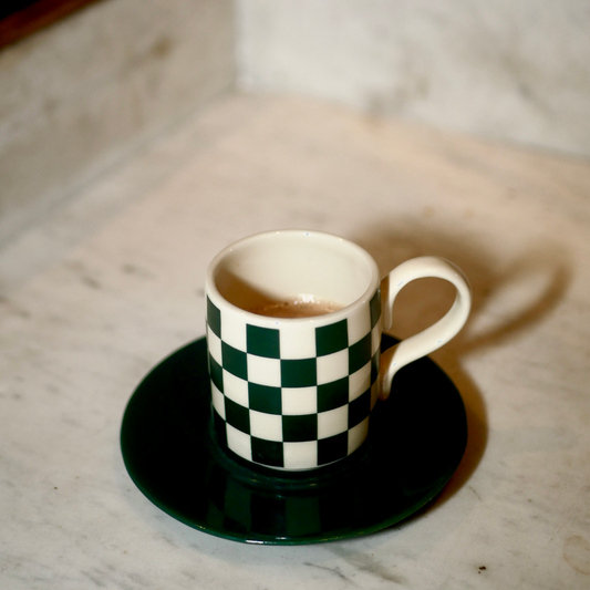 UitverkochtKoffiekopjes en melkkan - geblokt - set van 4