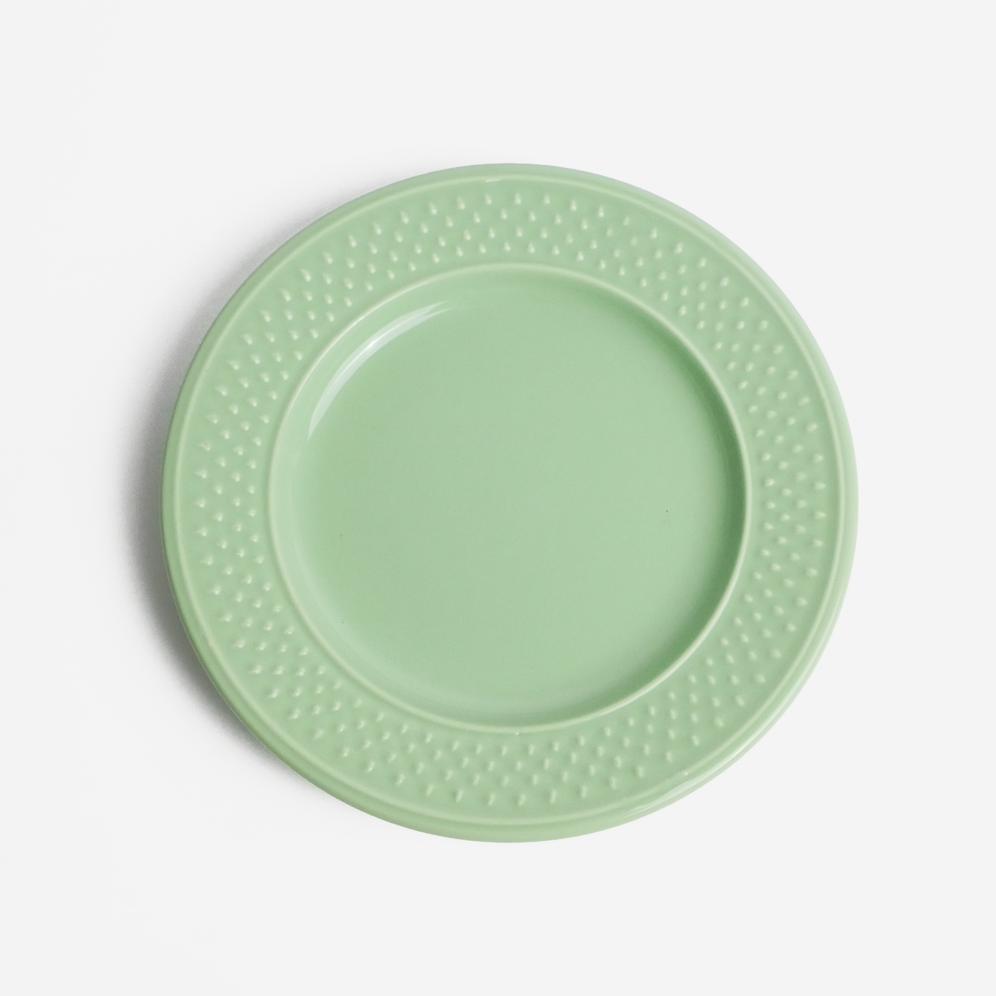 Set of four light green lunch plates with a polkadot relief along the rim. Glazed surface with a soft color and a simple, rounded form.